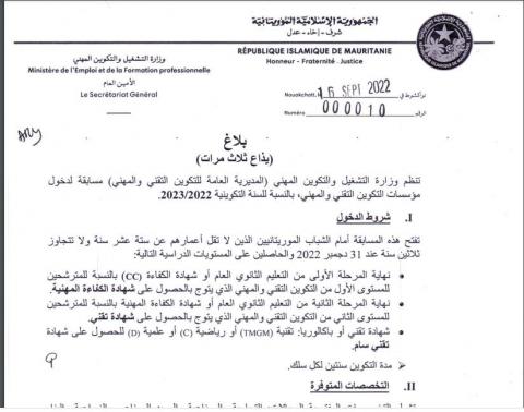 وحسب الإعلان فإن المسابقة مفتوحة أمام الشباب الموريتانيين الذيت لا تقل أعمارهم عن 16 ولا تتجاوز 30 سنة، والحاصلين على الشهادات المهنية على مستوى المرحلة الثانوية.