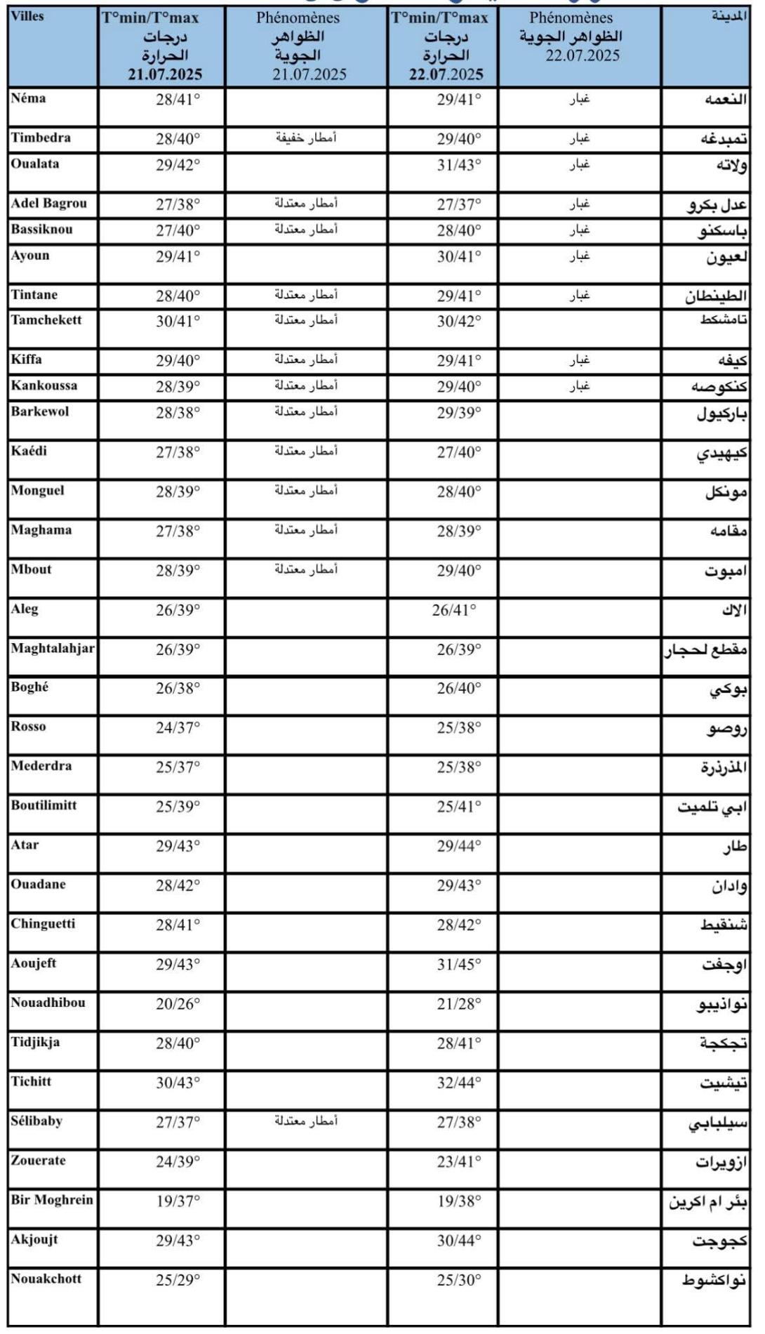 وأكدت في توقعاتها لليومين القادمين أن درجات الحرارة ستشهد ارتفاعًا ملحوظًا على آدرار وإينشيري وتكانت والحوضين، بينما ستكون الرؤية متأثرة بفعل الأتربة أو العواصف الرملية على الحوضين والعصابة.