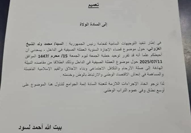 قررت وزارة الشؤون الإسلامية و التعليم الأصلي توحيد خطبة الجمعة القادمة 15محرم1447 هجرية الموافقة ل 11يوليو 2025 و ذلك حول موضوع ” أهمية قضاء العطلة الصفية في الداخل”