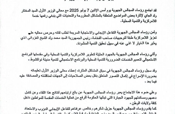 اجتمع رؤساء المجالس الجهوية يوم الاثنين 7 يوليو 2025 مع معالي الوزير الأول السيد المختار ولد اجاي، لبحث بعض المواضيع المتعلقة بالمشاكل المطروحة والتحديات التي يواجهها العمل التنموي واللامركزية في موريتانيا.