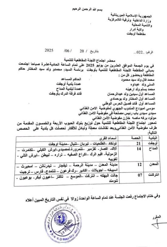 ترأس حاكم مقاطعة أوجفت السيد محمدو سيدي المختار الجمعة 20 يونيو 2025 اجتماع اللجنة المقاطعية للتنمية بحضور المندوب الجهوي لمفوضية الامن الغذائي والسلطات الادارية والامنية وعمدة بلدية أوجفت السنى عبداو وعمدة بلدية المداح محمد يسلم ولد ارهينه وبعد المداولات والنقاش تم توزيع بنوك الحبوب البالغ عددهم 54 على على القرى و االتجمعات الت