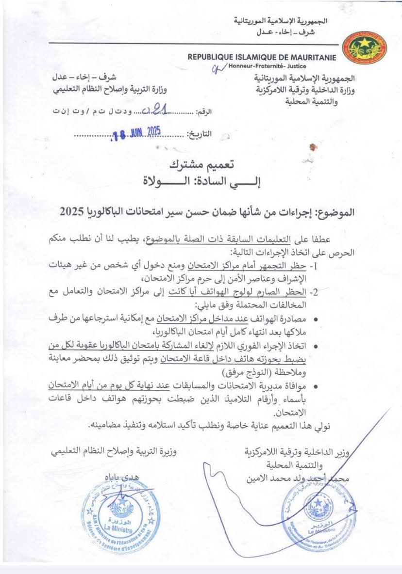 أصدرت وزارتا الداخلية والتربية في موريتانيا بيانا مشتركا موجها إلى كافة الولاة، يقضي بمنع التجمهر أمام مراكز امتحانات الباكالوريا 2025، وفرض عقوبات على استخدام الهواتف داخل قاعات الامتحان.