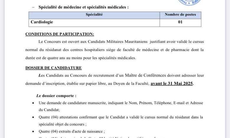 أعلنت كلية الطب والصيدلة بجامعة محمد الخامس بالمملكة المغربية عن مسابقة لتوظيف أستاذ محاضر واحد، لصالح وزارة التعليم العالي والبحث العلمي الموريتانية، في تخصص أمراض القلب.