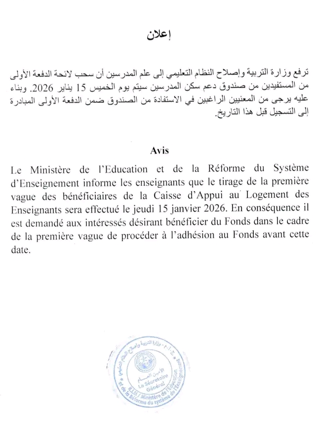 أعلنت وزارة التربية وإصلاح النظام التعليمي أن يوم 15 يناير سيكون موعدا لسحب لائحة الدفعة الأولى من المستفيدين من صندوق دعم سكن المدرسين، داعية جميع الراغبين في الاستفادة إلى التسجيل قبل هذا التاريخ.
