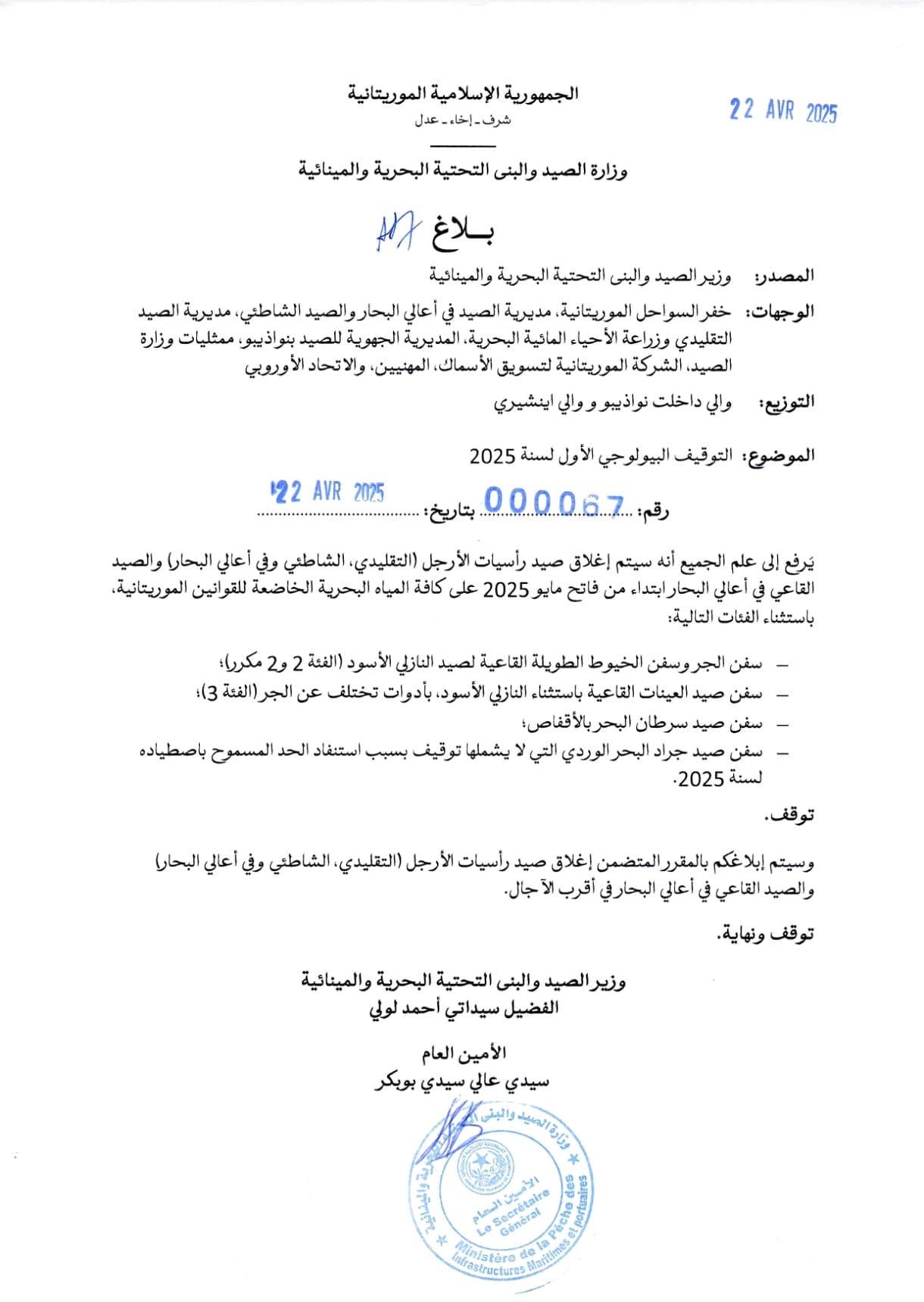 أعلنت وزارة الصيد والبنى التحتية البحرية والمينائية فاتح مايو موعدا للتوقيف البيولوجي الأول في 2025.