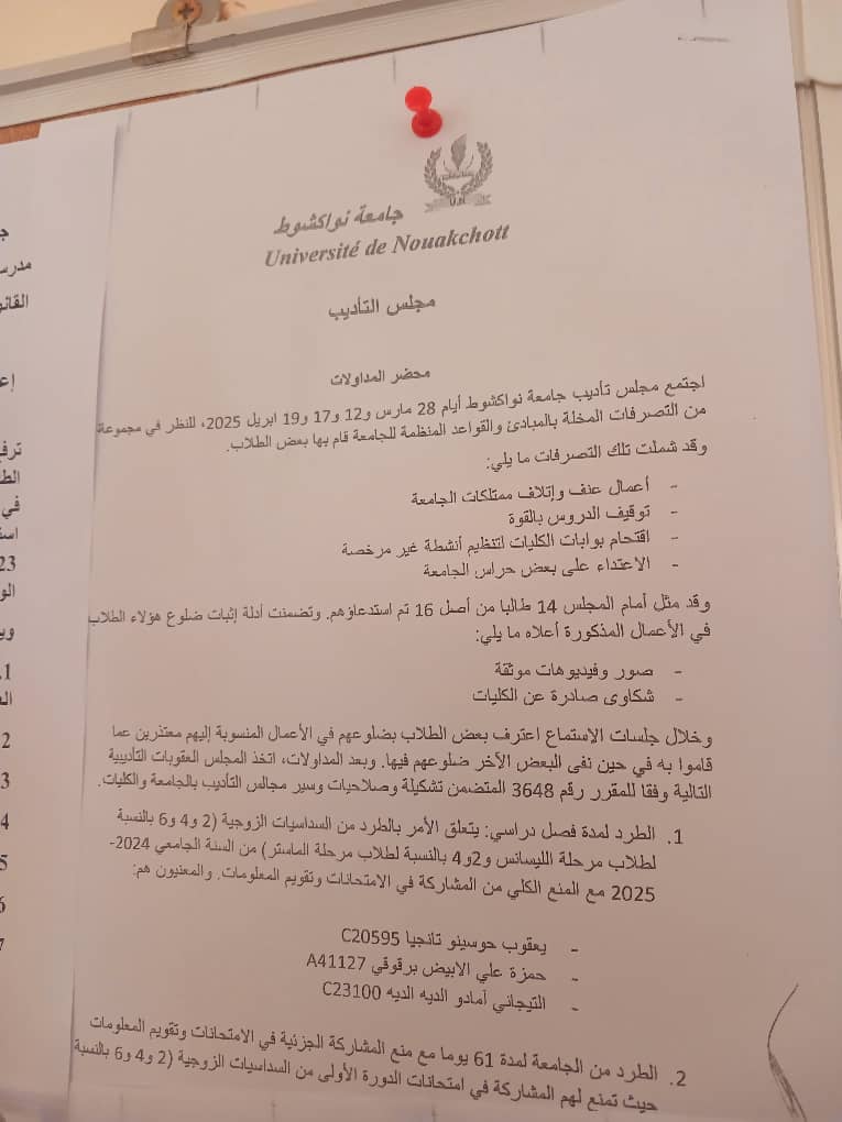 صادق المجلس التأديبي بجامعة نواكشوط، على طرد 14 طالبا مؤقتا، وذلك على خلفية أحداث الشغب الأخيرة بالجامعة.