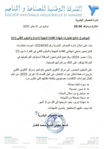 أعلنت شركة اسنيم نتائج المترشحين الناجحين في امتحان شهادتي الكفاءة المهنية CAP والدبلوم التقني BT.