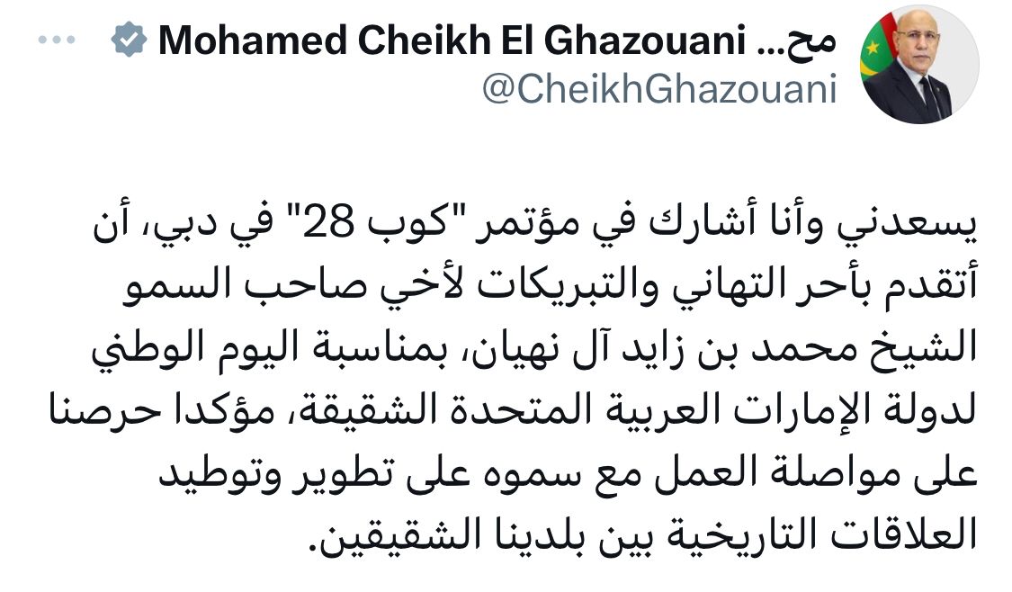 أجرى الرئيس محمد ولد الشيخ الغزواني، مساء اليوم، بدبي محادثات مع الرئيس الفرنسي إيمانويل ماكرون.