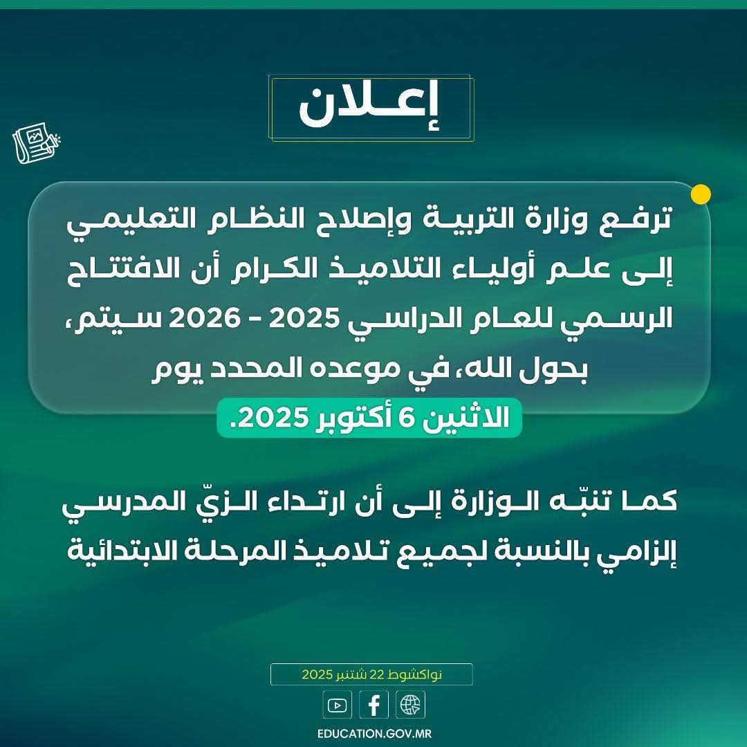 تسلّم سفير موريتانيا لدى المملكة العربية السعودية صاحب السعادة المختار داهي، اليوم الأربعاء 24 سبتمبر، دعوة رسمية لحضور حفل الافتتاح الرسمي للألعاب الأولمبية الإسلامية، المقرر تنظيمها في العاصمة الرياض خلال الفترة من 7 إلى 21 نوفمبر 2025.