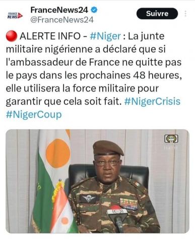 و قالت وسيلة الاعلام الفرنسية إن المجلس العسكري النيجري، أعلن أن السفير الفرنسي إذا لم يغادر البلاد في غضون 48 ساعة، فإنه سيستخدم القوة من أجل ضمان ذلك.