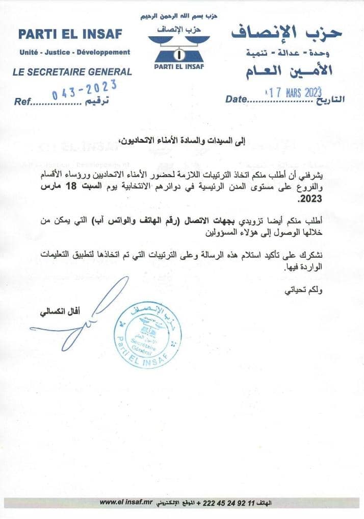 المعدن الاخباري : أظهرت مذكرة صادرة عن الأمين العام لحزب الانصاف الحاكم افالي انگيسال إلى الأمناء الاتحاديين للحزب أن يبلغوا رؤساء الاقسام و الفروع التواجد في المدن الرئيسية لدوائرهم ابتداءا من يوم غد السبت 18مارس .