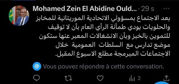 المعدن الاخباري : قال رئيس اتحاد أرباب العمل الموريتانيين، زين العابدين ولد الشيخ أحمد، إن الانشغالات التي عبرت عنها الاتحادية الموريتانية للمخابز والحلويات ستكون موضع تدارس مع السلطات العمومية، خلال الاجتماعات المبرمجة مطلع الأسبوع المقبل.