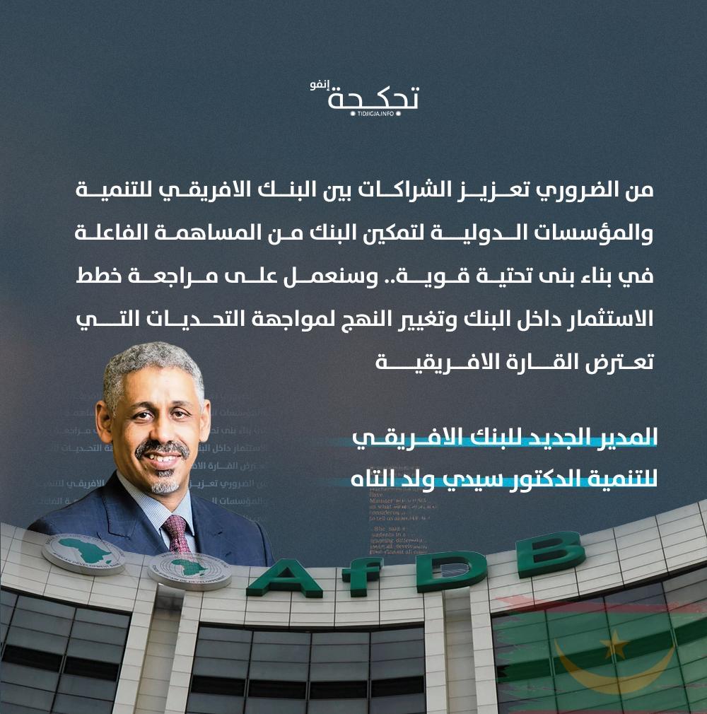 أكد المدير الجديد للبنك الافريقي للتنمية الدكتور سيدي ولد التاه ضرورة تعزيز الشراكات مع المؤسسات الدولية لتمكين البنك من المساهمة الفاعلة في بناء بنى تحتية قوية.
