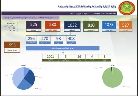المعدن الإخباري ـ قالت وزارة التجارة إن فرق حماية المستهلك وقمع الغش والمندوبيات الجهوية نفذت خلال شهر يناير 527 جولة داخل الأسواق أسفرت عن 4073 عملية تفتيش للمحلات والمجازر والمجمعات التجارية تم خلالها رصد 1032 من المخالفات موزعة كما يلي: