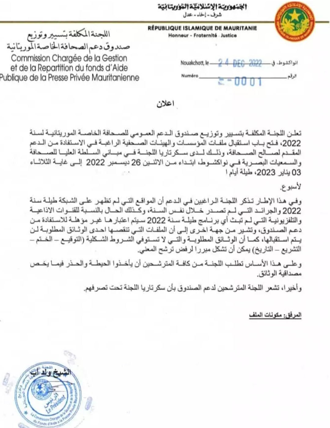 المعدن الإخباري - أعلنت اللجنة المكلفة بتسيير صندوق دعم الصحافة الخاصة فتح باب استقبال ملفات المؤسسات الصحفية الراغبة في الحصول على الدعم، وذلك ابتداء من الاثنين القادم، وإلى غاية الثالث من يناير.