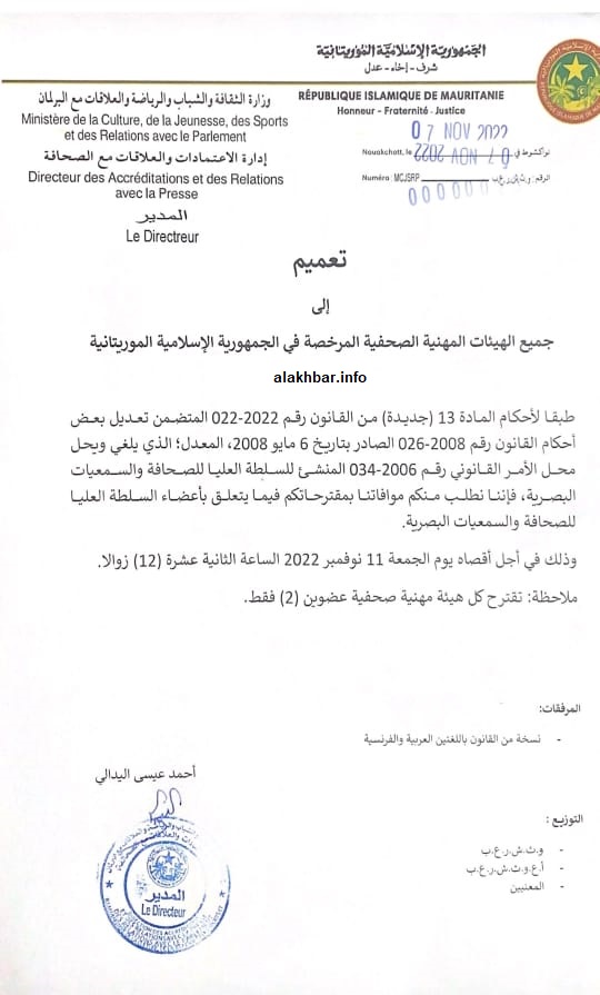 المعدن الإخباري ـ أصدرت السلطة العليا للصحافة والسمعيات البصرية "HAPA" يوم أمس الأربعاء تعميما إلى الهيئات الصحفية المرخصة، من أجل اقتراح من سيمثلها في عضوية السلطة.