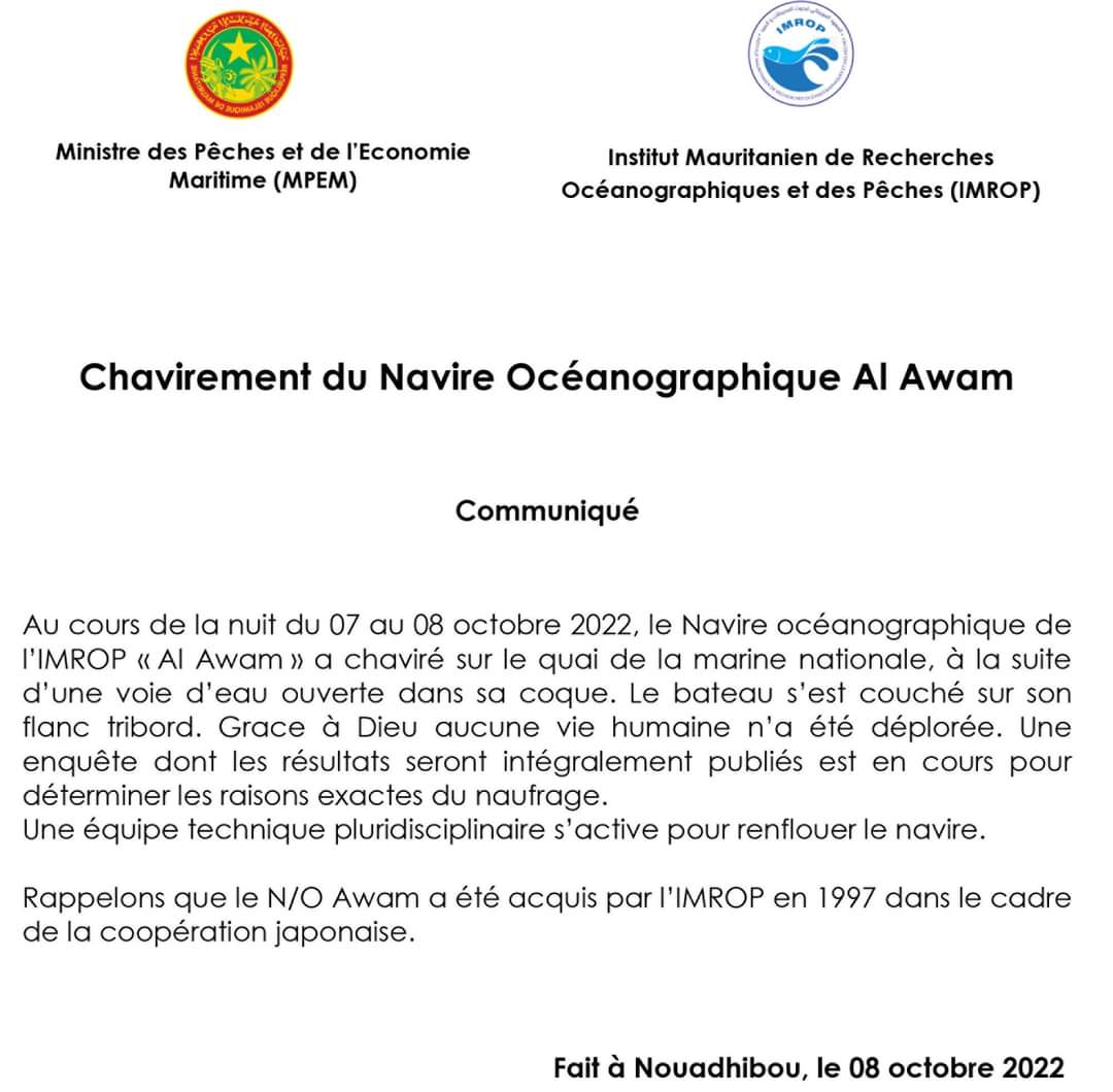 أعلن المعهد الموريتاني لبحوث المحيطات والصيد عن فتح تحقيق في غرق سفينته "العوام" لمعرفة الأسباب الحقيقية وراء الحادث وبنشر نتائج هذا التحقيق للرأي العام.