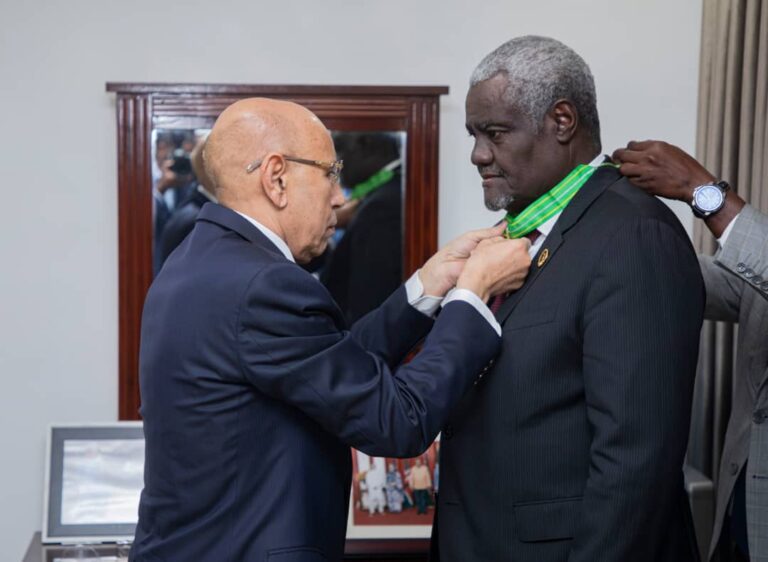 وشح فخامة رئيس الجمهورية، السيد محمد ولد الشيخ الغزواني، مساء أمس في مقر السفارة الموريتانية في أديس أبابا (أثيوبيا)، رئيس مفوضية الاتحاد الإفريقي، المنتهية ولايته سعادة السيد موسى فكي محمد، ومجموعة من كبار موظفي الاتحاد الإفريقي، تقديرا للجهود الكبيرة التي بذلوها من أجل إفريقيا طيلة فترة توليه الرئاسة الدورية للاتحاد الإفريقي.