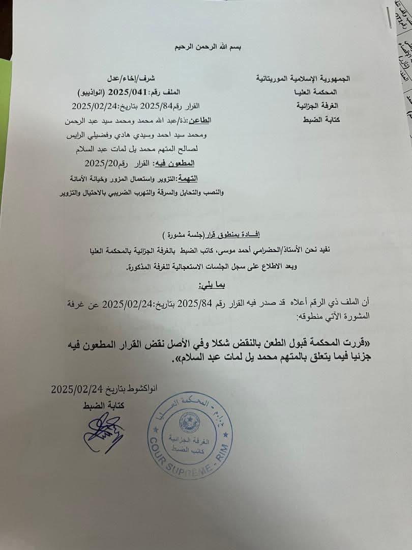 وأصدرت المحكمة أمرا بإطلاق سراح نائب رئيس جهة نواذيبو ", السيد محمد يل ولد عبد السلام، وفق ما أكدته مصادر من مدينة نواذيبو.