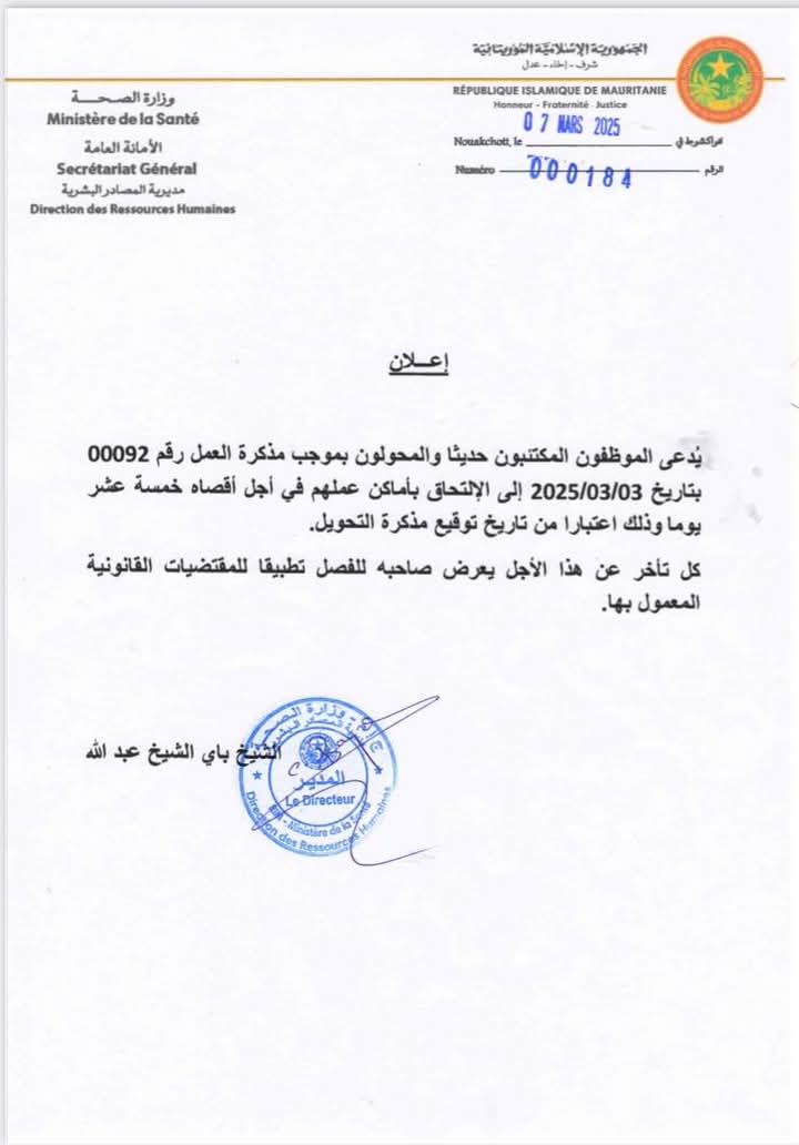 يدعى الموظفون المكتتبون حديثا والمحولون بموجب مذكرة العمل رقم 00092 بتاريخ 03/03/2025 إلى الالتحاق بأماكن عملهم في أجل أقصاه خمسة عشر يوما اعتبارا من تاريخ توقيع مذكرة التحويل.
