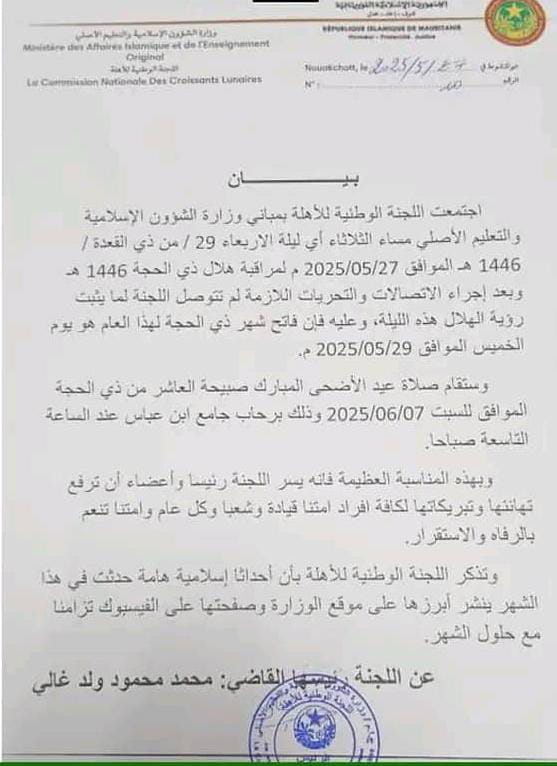 أعلنت اللجنة الوطنية للأهلة أن الخميس 29 مايو 2025، هو فاتح شهر ذي الحجة من العام الهجري 1446.