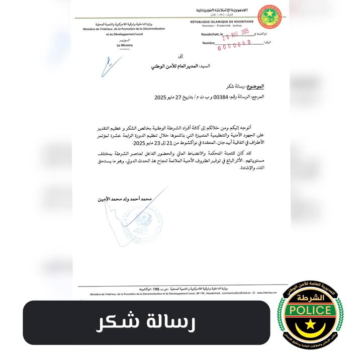 وجه وزير الداخلية وترقية اللامركزية والتنمية المحلية رسالة تهنئة إلى كافة أفراد الشرطة الوطنية بمناسبة تأمين الدورة الرابعة عشرة لمؤتمر الأطراف في اتفاقية أبيدجان، المنعقدة في نواكشوط من 21 الى 23 مايو 2025.