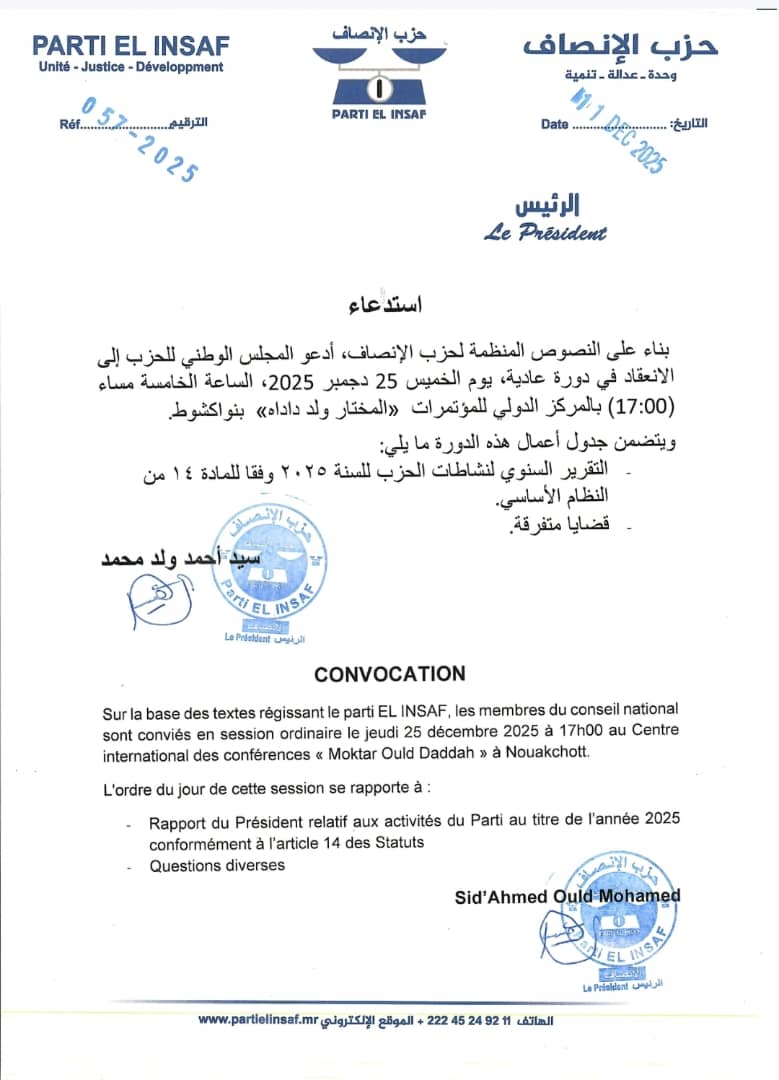 دعا حزب الإنصاف مجلسه الوطني إلى انعقاد دورة عادية يوم الخميس المقبل في مركز المؤتمرات الدولي (المختار ولد داداه).
