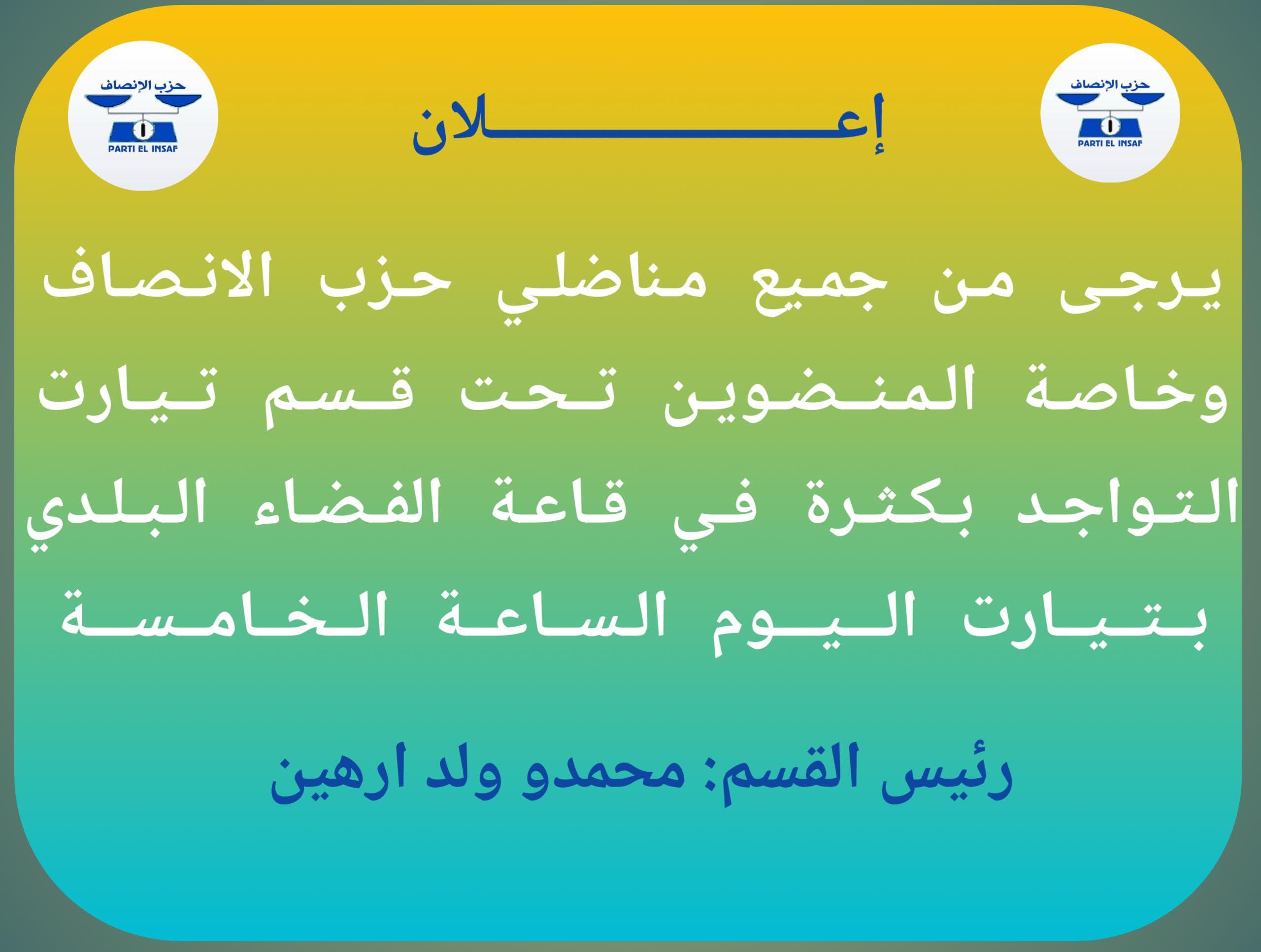 دعا رئيس قسم تيارت، محمد ولد ارهين، كافة مناضلي ومناضلات حزب الإنصاف إلى الحضور بكثافة والمشاركة الفاعلة في حملة شرح مخرجات المؤتمر التي أطلقها الحزب، والمقررة على مدى ثلاثة أيام، والمتوزعة على ولايات نواكشوط الثلاث.