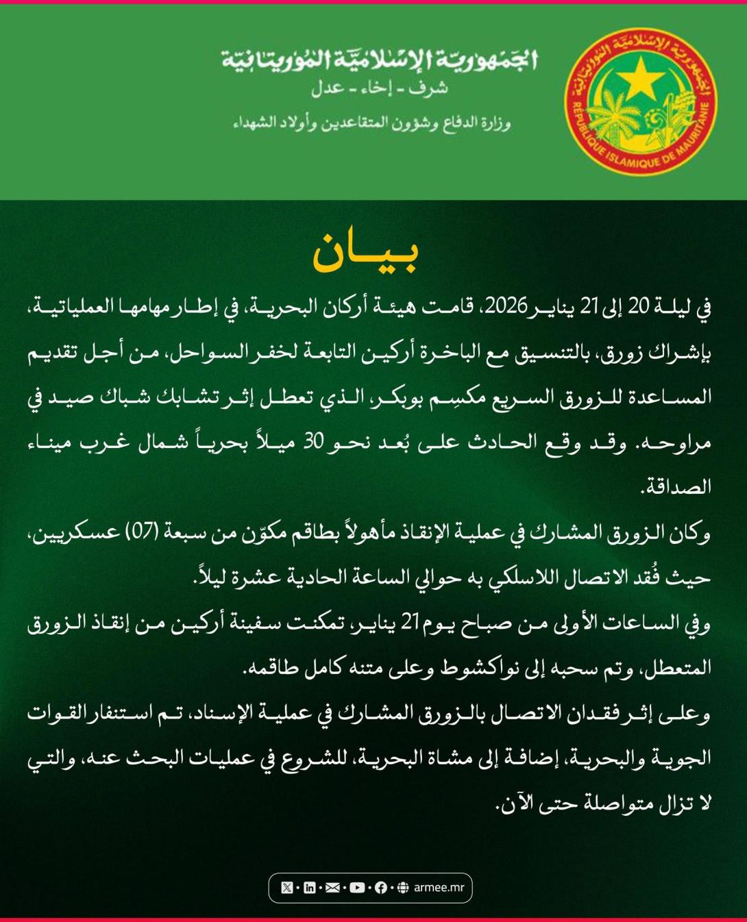 قال الجيش الموريتاني إن زورقا عسكريا شارك في عملية إسناد بحرية لإنقاذ زورق صيد تعطّل قبالة السواحل، فقد الاتصال به، مشددا على أن على متنه 7 أشخاص.