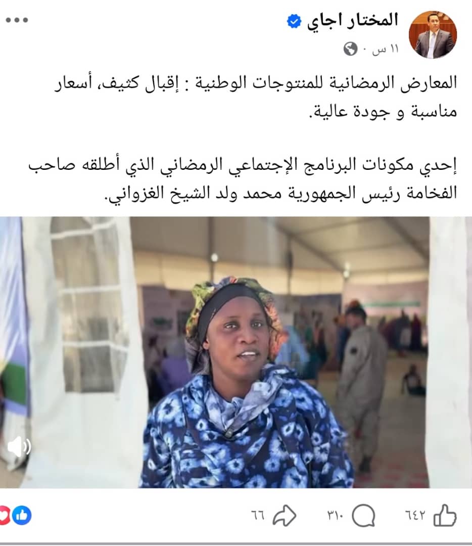 وأضاف ولد اجاي في تدوينة له على الفيس بوك أن هذه المعارض تعتبر "إحدي مكونات البرنامج الإجتماعي الرمضاني الذي أطلقه صاحب الفخامة رئيس الجمهورية محمد ولد الشيخ الغزواني".