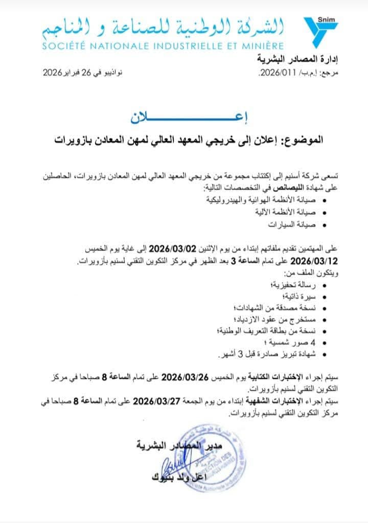 أعلنت الشركة الوطنية للصناعة والمناجم (أسنيم) أنها تسعى لاكتتاب مجموعة من حاملي شهادة الليسانس بالمعهد العالي لمهن المعادن (IS2M) بازويرات في التخصصات التالية: