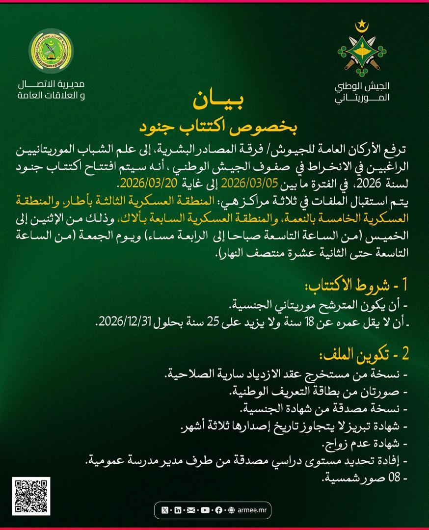 أعلنت مديرية الاتصال والعلاقات العامة بـالجيش الوطني الموريتاني، عن فتح باب اكتتاب جنود لصالح الجيش الوطني لسنة 2026، وذلك خلال الفترة الممتدة من 5 مارس 2026 إلى 20 مارس 2026.