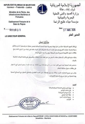 وأوضح المدير العام للمؤسسة، مختار ملل جا، في مذكرة عمل صادرة اليوم، أن هذا الإجراء يهدف إلى ضبط حركة السفن وتسجيل كميات الأسماك المفرغة بدقة، بما يعزز الشفافية ويحسن آليات التسيير.