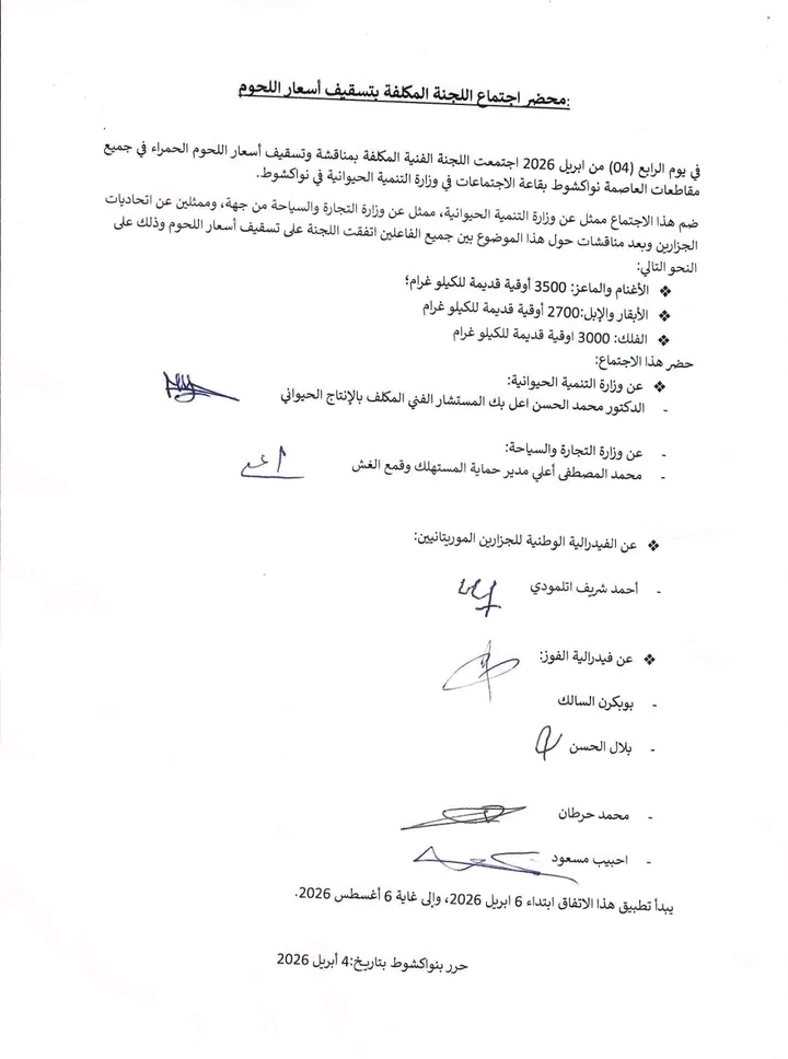 أعلنت الحكومة، اليوم السبت، التوصل إلى اتفاق مع اتحاديات الجزارين يقضي بتسقيف أسعار اللحوم الحمراء، وذلك خلال اجتماع احتضنته وزارة التنمية الحيوانية في نواكشوط.