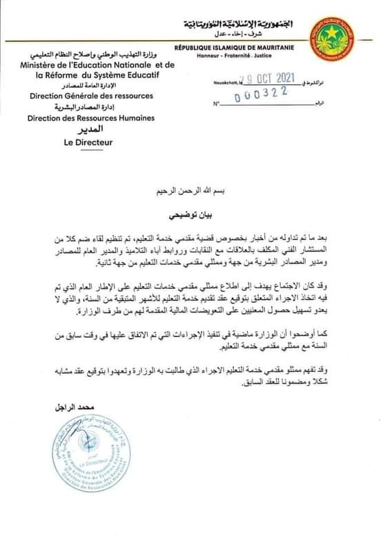 توضيح من وزارة التهذيب الوطني بخصوص ماتم تداوله حول قضية مقدمي خدمات التعليم،