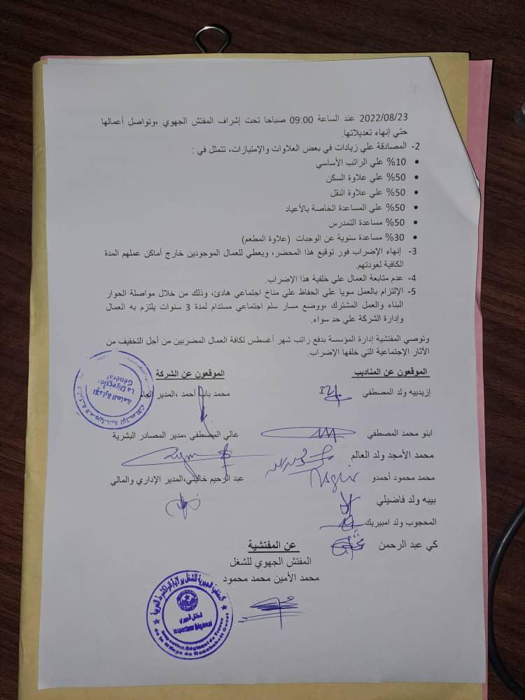 ووفق المحضر يتم إنهاء الإضراب فور توقيع المحضر ويعطي للعمال الموجودين خارج أماكن عملهم المدة الكافية لعودتهم.
