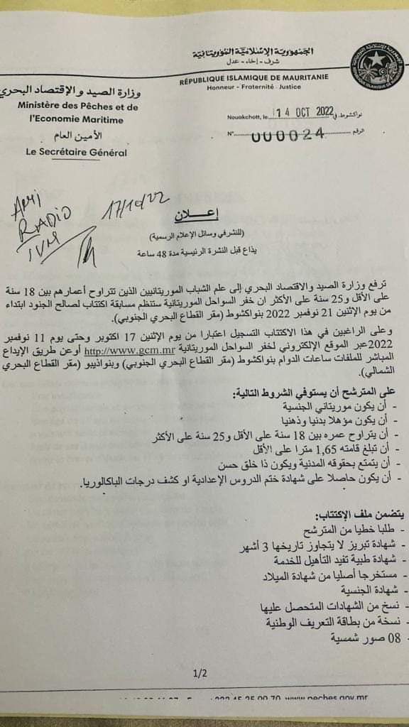 المعدن الإخباري ـ اعلنت وزارة الصيد أن خفر السواحل الموريتاني بصدد اكتتاب 100جندى و مهندسين اثنين.