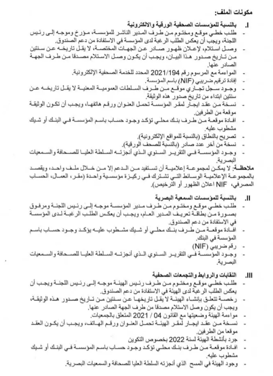 المعدن الإخباري - أعلنت اللجنة المكلفة بتسيير صندوق دعم الصحافة الخاصة فتح باب استقبال ملفات المؤسسات الصحفية الراغبة في الحصول على الدعم، وذلك ابتداء من الاثنين القادم، وإلى غاية الثالث من يناير.