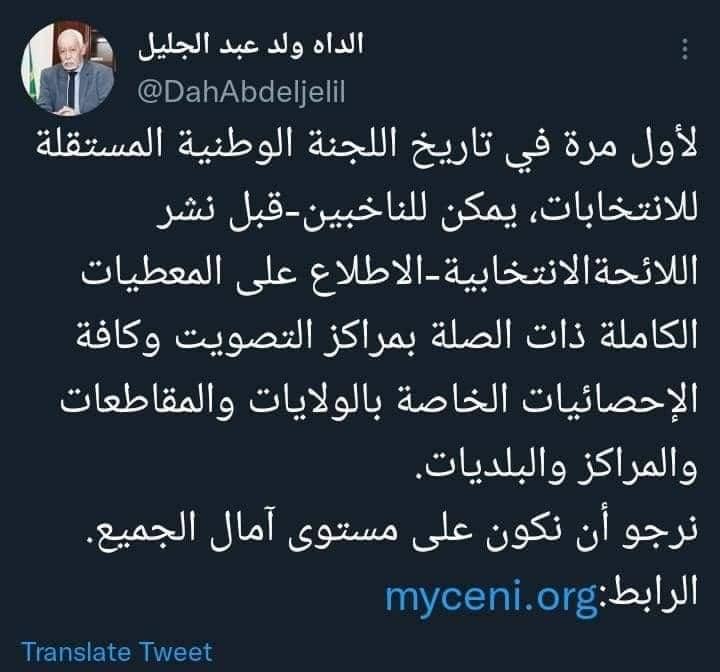 هذه المعلومة جاءت في تغريدة نشرها رئيس اللجنة مساء أمس ،على صفحته بتويتر، مؤكدا أن ذلك يعتبر سابقة في تاريخ اللجنة الوطنية المستقلة للانتخابات، إذ لم يتسن الأمر من قبل إلا بعد نشر اللائحة الانتخابية كاملة.