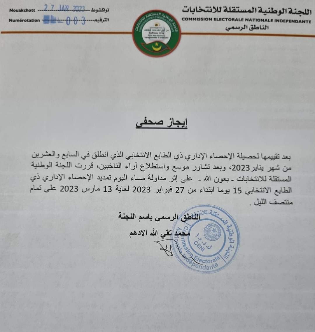 المعدن الإخباري - أعلنت اللجنة الوطنية المستقلة للانتخابات، مساء اليوم الاثنين، تمديد الإحصاء الإداري ذي الطابع الانتخابي لمدة 15 يوما.