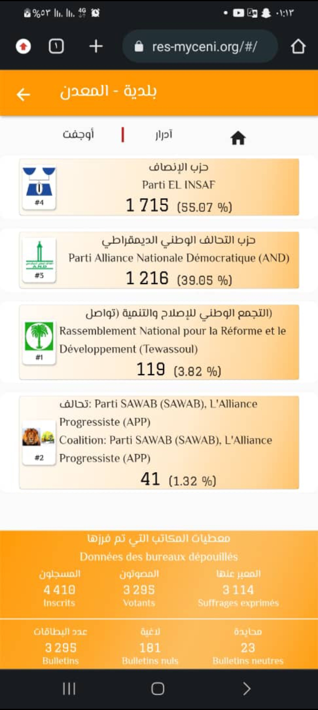 المعدن الإخباري ـ أظهرت النتائج المعلنة من طرف اللجنة الوطنية المستقلة للانتخابات فوز المرشح عن حزب الإنصاف الحاكم الشيخ محمد ماحي ولد الشيخ محمد الأمين ولد سيدينا بمنصب عمدة بلدية معدن العرفان حيث حصل على 1715 صوتا أي ما يمثل نسبة 55,07%.