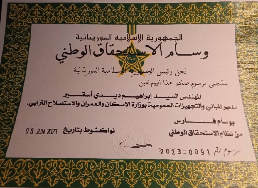 المعدن الإخباري ـ وشح وزير الإسكان والعمران والاستصلاح الترابي سيدي أحمد ولد محمد الجمعة باسم الرئيس محمد ولد الشيخ الغزواني، مدير المباني والتجهيزات العمومية بالوزارة المهندس إبراهيم ولد اسقير بوسام فارس من نظام الاستحقاق الوطني.