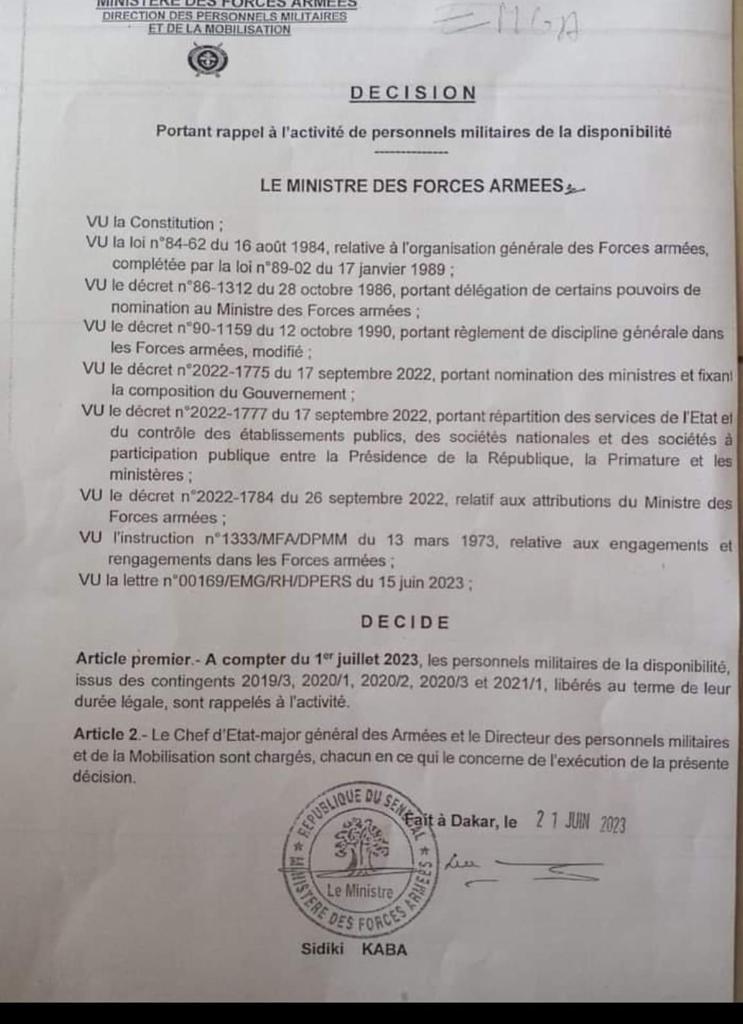 أصدر الرئيس السينغالي ماكي صال مرسوما رئاسيا يقضى بإعادة كل المتقاعدين في القوات المسلحة منذ العام (2019) الى الخدمة.