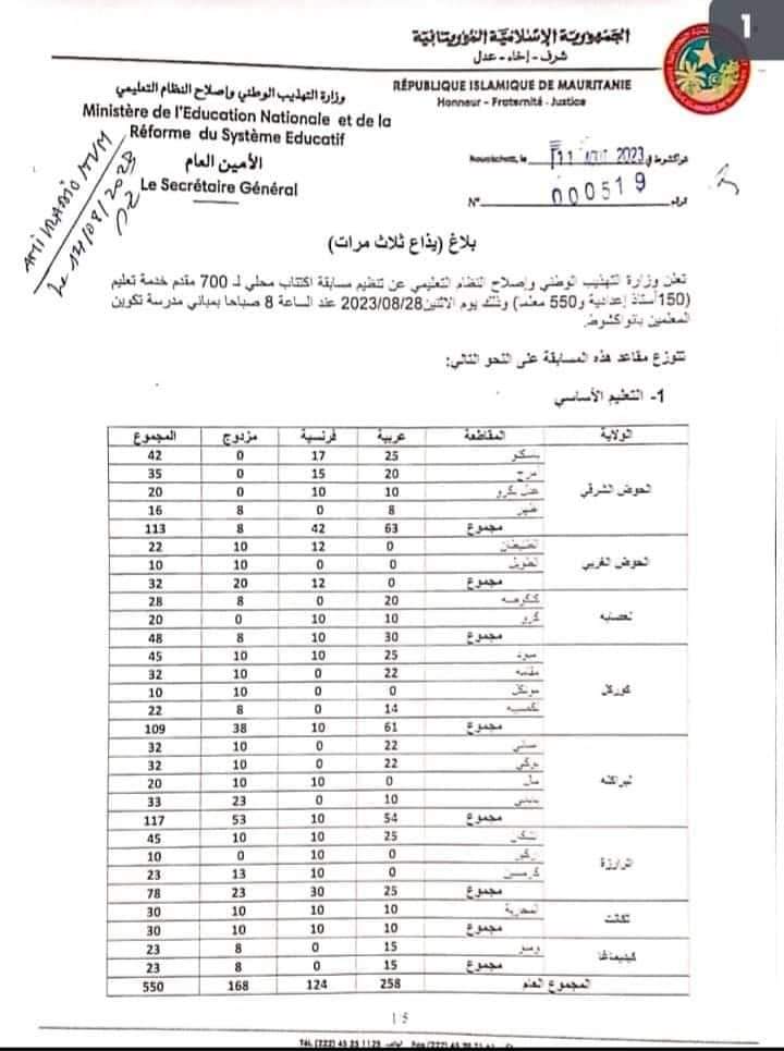 المعدن الاخباري : أعلنت وزارة التهذيب الوطني وإصلاح النظام التعليمي رسميا عزمها اكتتاب 700 مقدم خدمة تعليم. وتتوزع المقاعد على عدة مقاطعات بمختلف ولايات الوطن، بين مدرس بالعربية وآخر بالفرنسية ومدرس مزدوج. التفاصيل