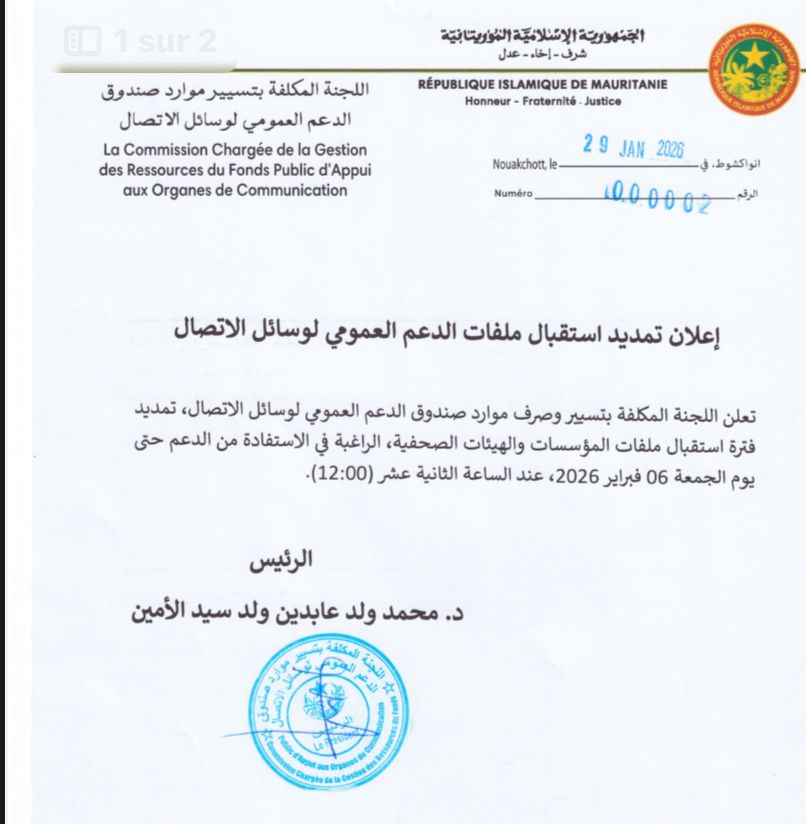 أعلنت اللجنة المكلفة بتسيير وصرف موارد صندوق الدعم العمومي لوسائل الاتصال عن تمديد فترة استقبال ملفات المؤسسات والهيئات الصحفية الراغبة في الاستفادة من الدعم العمومي، وذلك إلى غاية يوم الجمعة 06 فبراير 2026 عند الساعة ا
