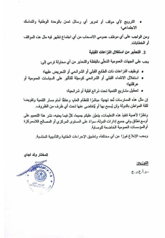 أمر الوزير الأول المختار ولد اجاي أعضاء الحكومة ومن في رتبتهم برصد المخالفات المتعلقة بالأقوال أو الممارسات التي تتنافى مع قيم الجمهورية ومبادئ المواطنة لدى موظفي ووكلاء الدولة، وتطبيق الإجراءات العقابية والتأديبية المناسبة على مرتكبيها.