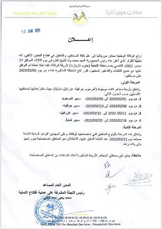 أعلنت شركة معادن موريتانيا عن قرار بإعادة أربعة مجاهر للمنقبين عن الذهب، وتقع بالقرب من موقع شركة تازيازت، إضافة إلى استصلاح أخرى تمهيدا لفتحها أمام المنقبين.