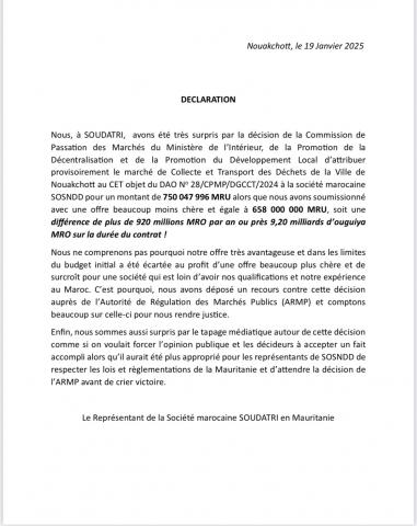 جاء ذلك في بيان صادر عن الشركة إستغربت فيه منح الصفقة مقابل 750 مليون أوقية جديدة مشيرة أنها تقدمت بعرض أقل تكلفة من المبلغ الذي تم منحه لشركة SOSNDD .