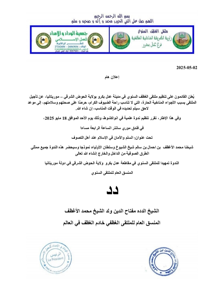 يعلن القائمين علي علي تنظيم ملتغي الغظف السنوي في مدينة عدل بكرة بولاية الحوض الشرقي - موريتانيا - عن تأجيل الملتقي بسبب الاجواء المناخية التي لا تناسب راحة الضيوف الكرام, حرصنا علي صحتهم وسلامتهم , الي موعد لاحق سيتم تحديده في الوقب المناسب , ان شاء الله تعالي .