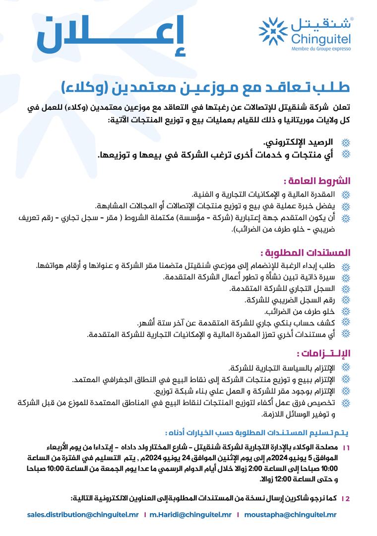 تعلن شركة شنقيتل للإتصالات عن رغبتها في التعاقد مع موزعين معتمدين (وكلاء) للعمل في كل ولايات موريتانيا و ذلك للقيام بعمليات بيع و توزيع المنتجات الآتية: